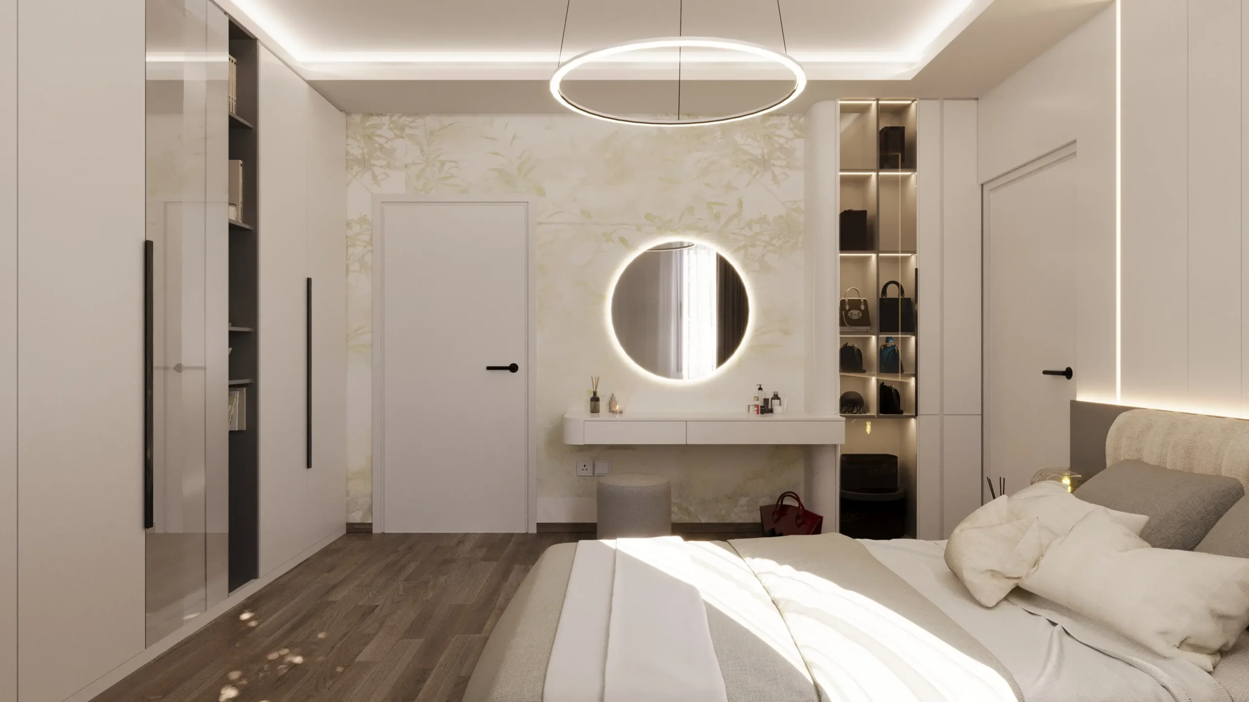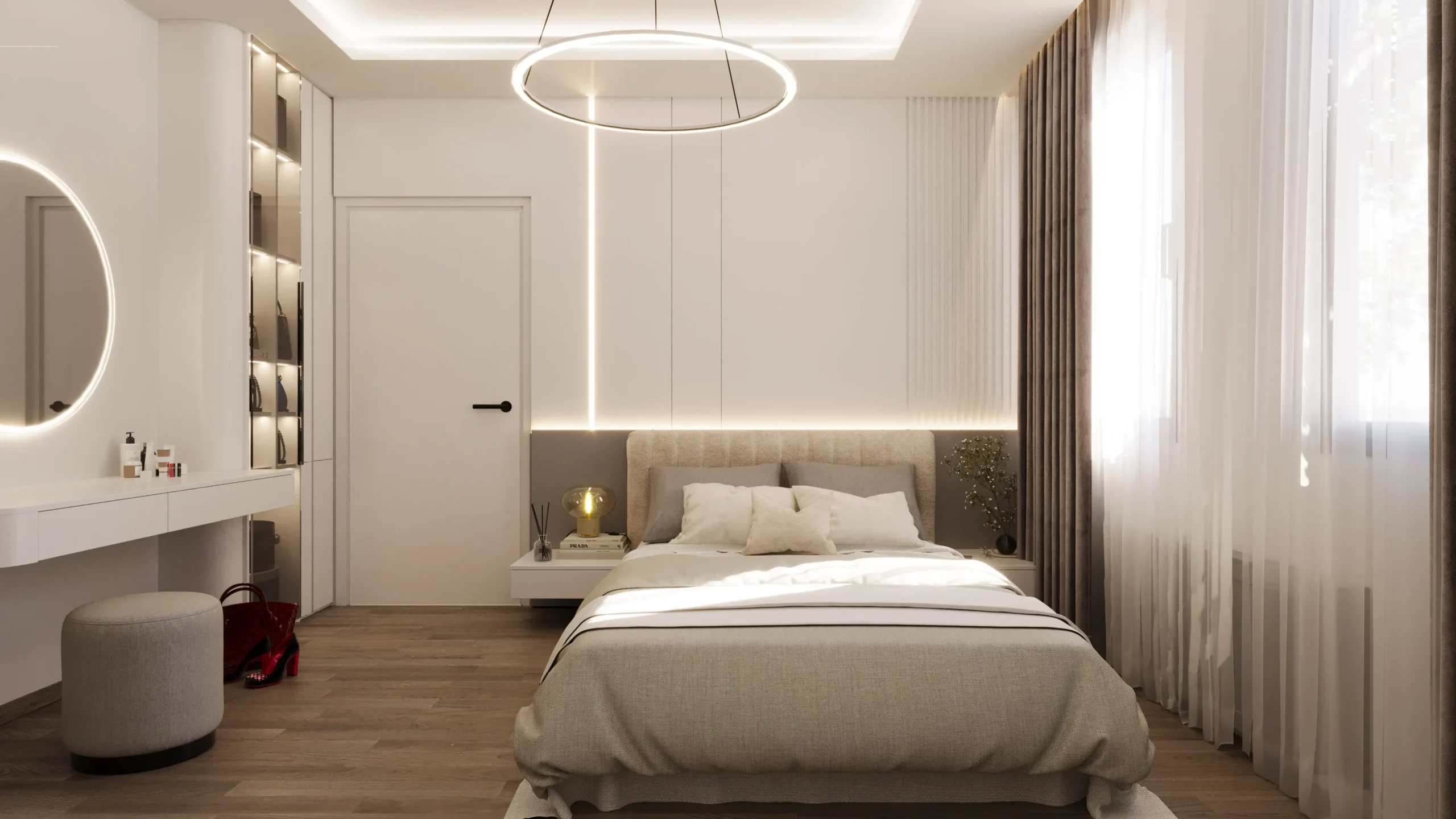 Integrated ambient and task lighting elegantly defines zones like the dressing area and sleeping space, influencing a sense of clarity and quiet sophistication.