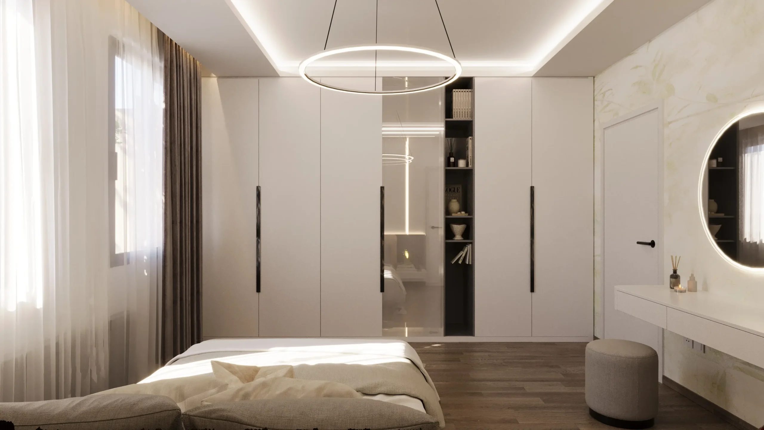 We designed this simple bedroom as a serene and highly functional retreat, where minimalist aesthetics meet understated luxury.