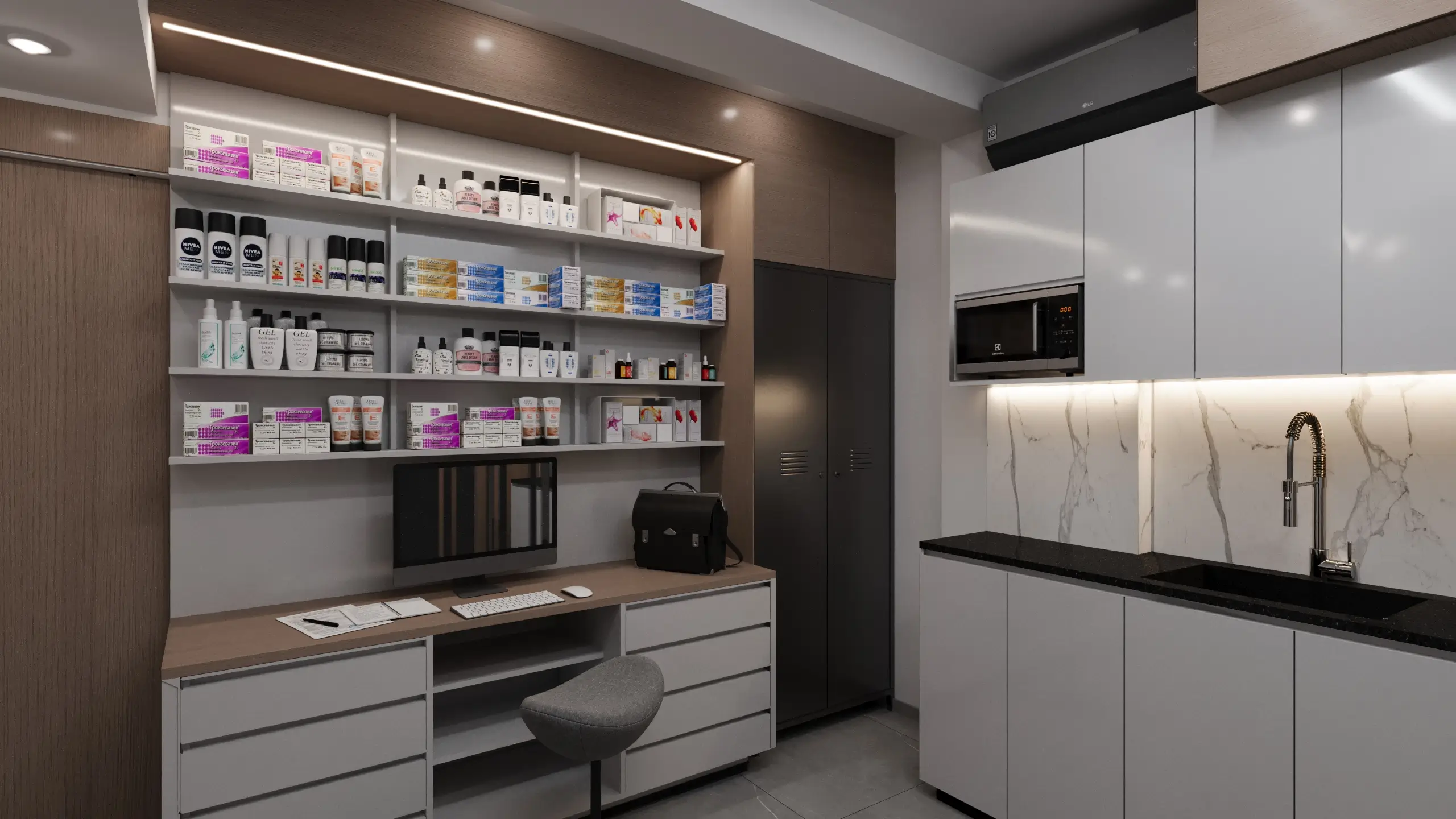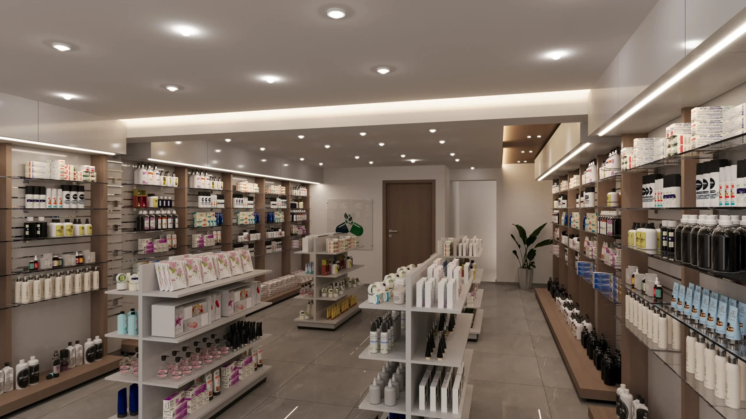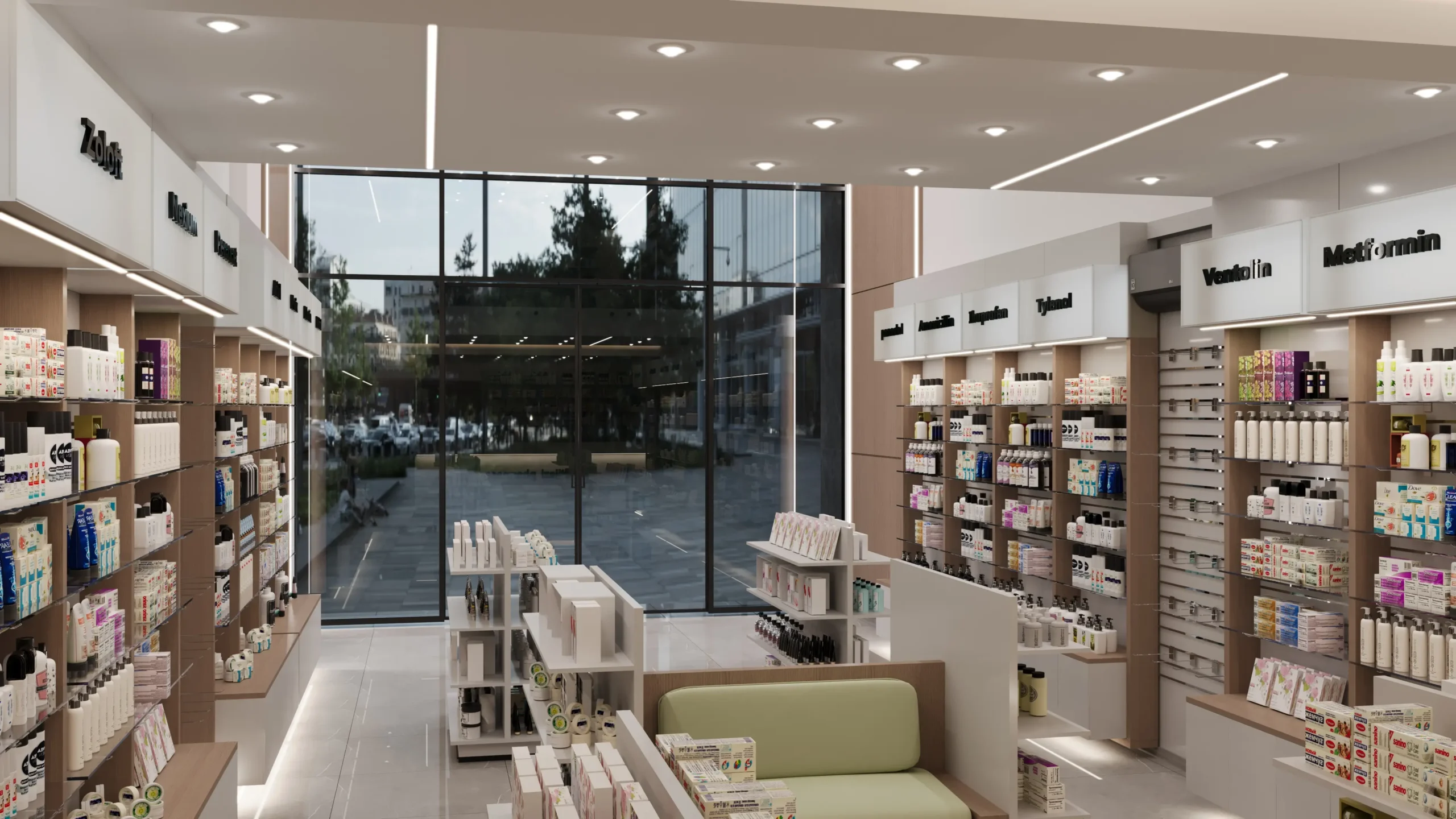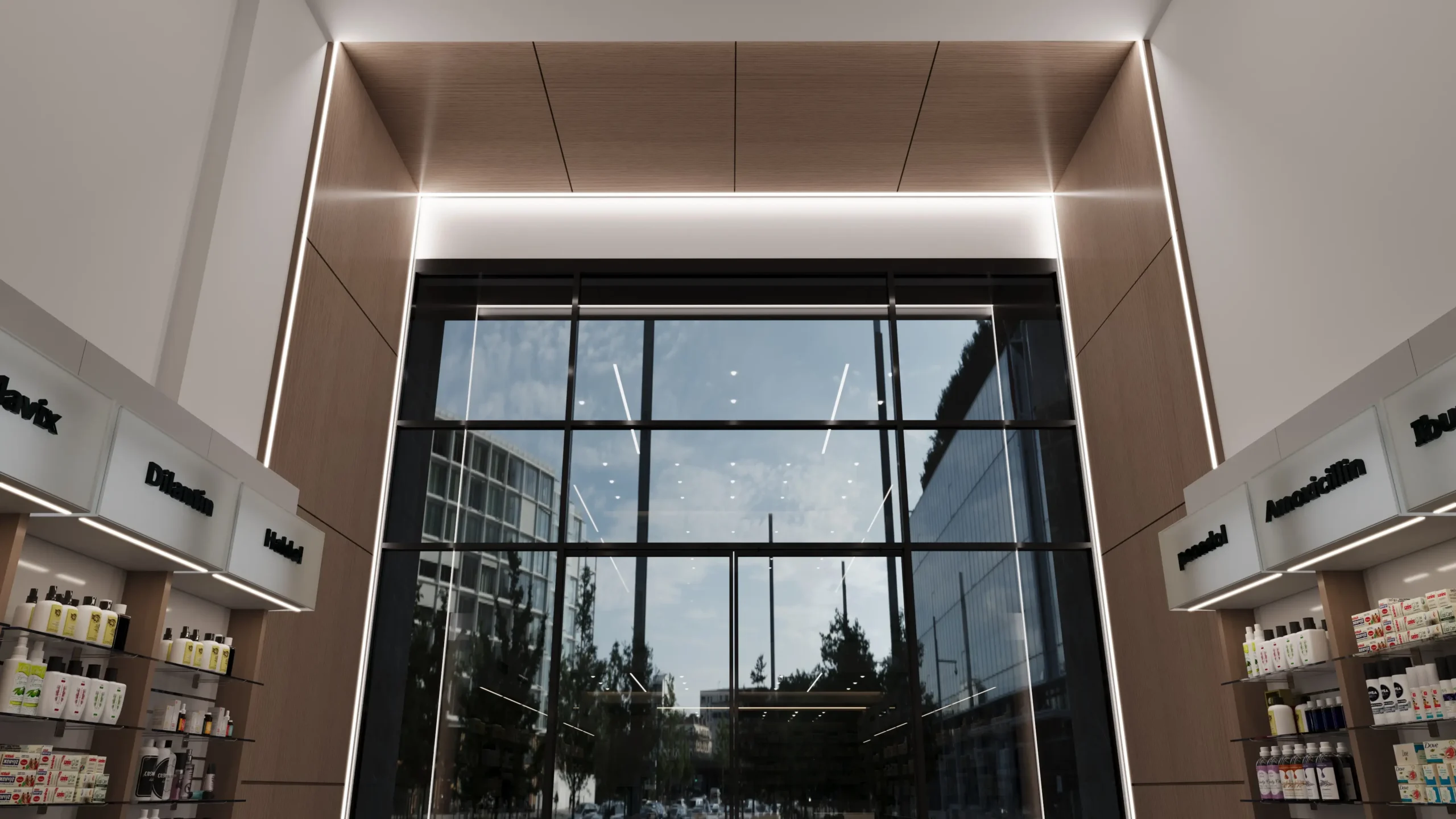 We designed this modern pharmacy to redefine the retail healthcare experience. The spatial planning and thoughtful layouts create a welcoming atmosphere that promotes well-being and trust. By blending natural wood accents with clean architectural lines and abundant lighting, the design palette aims to reduce stress and foster a sense of calm, ensuring every visit is both comfortable and reassuring. This is a space where care and comfort are paramount, influencing a positive emotional connection with every customer.